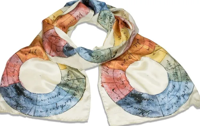 Diesen luftig-leichten Schal von Petra Waszak aus 100 % Seide schmückt Goethes selbst entworfener Farbkreis. Sein Werk »Zur Farbenlehre« enthält langjährige Überlegungen, Studien und Versuche des großen Schriftstellers zum Wesen der Farbe.