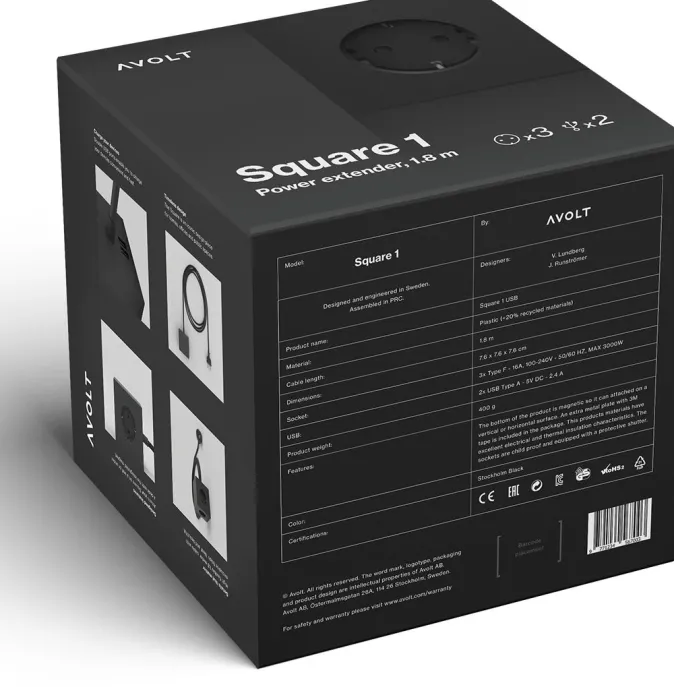 Er verfügt über drei Typ F Schuko-Steckdosen, doppelte USB-Typ-C-Anschlüsse mit einer Ladeleistung von bis zu 30 W und ein hochflexibles 1,8 m langes Netzkabel. Der Körper des Produkts ist magnetisch. In Verbindung mit der mitgelieferten Eisenplatte mit voraufgetragenem Klebestreifen kann es sicher auf jeder Oberfläche befestigt werden. Hergestellt aus feinsten Materialien mit exquisiten Oberflächen bietet der Square 1 USBC ein kompromissloses Gefühl von Qualität und Sicherheit.