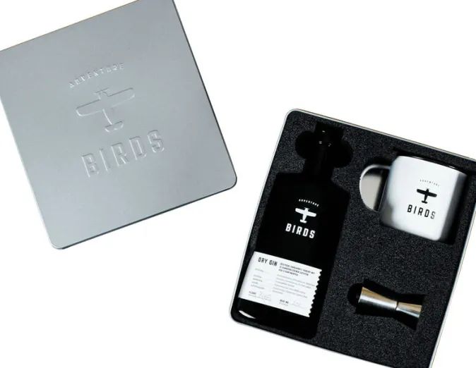 Die Adventure Case enthält eine Flasche BIRDS Dry Gin, eine Vintage Tasse und ein Barmaß.