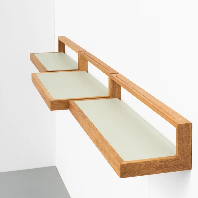 Das Ablagebord »buck« ist ein schlankes, schlichtes, leichtes Möbel, das es in drei Varianten gibt. Durch eine verdeckte Aluminiumleiste ist es an der Wand befestigt – wobei die Höhe natürlich frei wählbar ist. Das macht den buck flexibel für die Nutzung in Flur, Wohnzimmer, Kinderzimmer, Herrenzimmer, Salon oder, oder, oder. Als Ablage, Nachttisch oder kleines Schreibpult. In drei Größen erhältlich.
