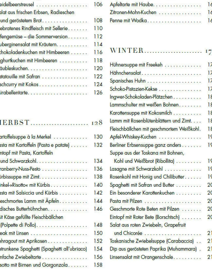 Die Rezepte sind nicht nur ein sprachliches Glanzstück, sondern auch sehr lehrreich: Charmant erklärt die Autorin, warum der deutsche Kümmel dem orientalischen Kreuzkümmel in nichts nachsteht, dass es von Ossobuco auch eine Sommervariante mit Weißwein gibt, dass Pasta und Kartoffeln gemeinsam ein Festmahl ergeben und wie ein Bad in Kokosmilch beinahe jedes Gericht besser macht. Für jede Jahreszeit findet die Autorin die passenden Rezepte: Im Frühling gibt es Petersilienrisotto, im Sommer Brathuhn mit Fenchel und Pastis, im Herbst Mirabellentarte und im Winter Lasagne mit Schwarzkohl. Elisabeth Raethers Küche ist abwechslungsreich, unkompliziert, und jedes Gericht ist ein Genuss.