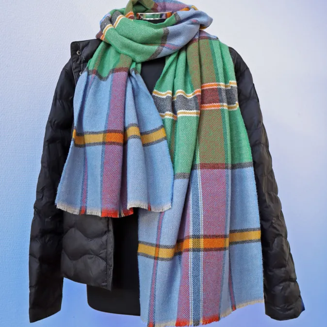 Erleben Sie kuschelige Wärme und zeitlosen Stil mit unserem extrabreiten Wollschal, der mit seinem markanten Karomuster und kurzen Fransen beeindruckt. Die kräftigen Farbflächen, die durch kontrastfarbene Streifen akzentuiert werden, machen diesen Schal zu einem echten Hingucker und ermöglichen vielseitige Kombinationsmöglichkeiten.