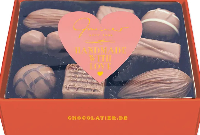 »Handmade with Love« Pralinen: Entdecken Sie die feinste Pralinenspezialität als Vollmilchvariation bester handgefertigter Gmeiner-Pralinen ohne Alkohol. Jede Praline wurde sorgfältig von Hand gefertigt und mit einer Prise Liebe verfeinert. Die Verwendung der besten Zutaten garantiert ein einzigartiges Geschmackserlebnis.