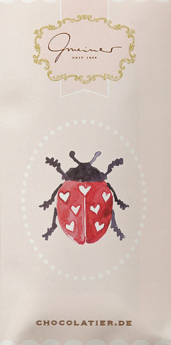 Entdecken Sie die Lieblingsschokolade der Tochter des Hauses Maxima – die süßen Marienkäfer. Diese zauberhaften Schokoladenkreationen werden aus feinster Gmeiner-Vollmilchschokolade (40 % Kakaoanteil) hergestellt und mit viel Nougatcrisp verfeinert.