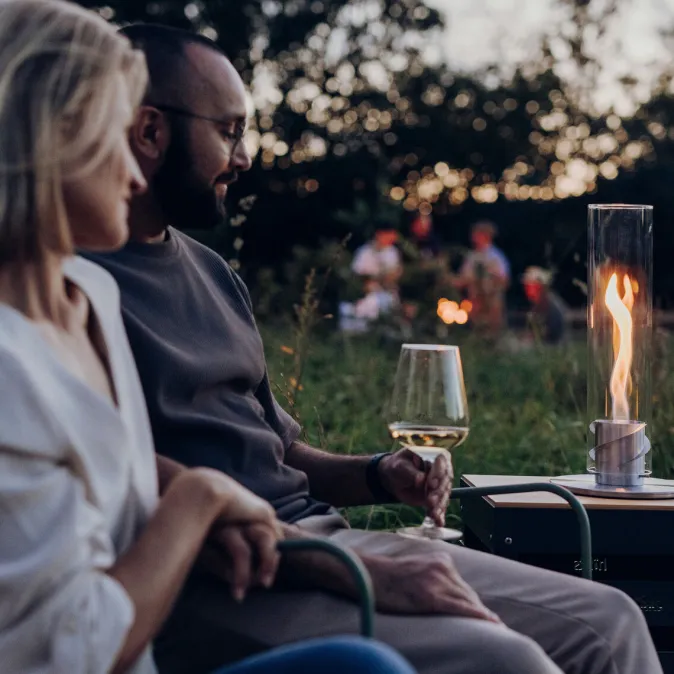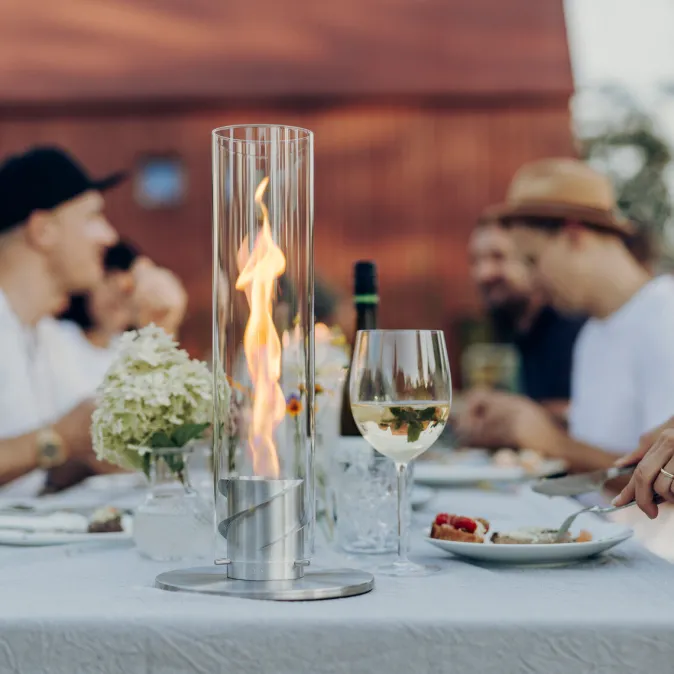 Wohlige Wärme und geselliges Beisammensein sind die unverwechselbaren Eigenschaften des Feuers, die uns seit jeher in seinen magischen Bann ziehen. »SPIN« fängt genau diese einzigartige Lagerfeueratmosphäre auf spektakuläre Art und Weise in einem Glaszylinder ein und lässt Ihren Balkon, Ihre Terrasse, Ihr Wohnzimmer oder Ihren Esstisch im sanften Licht der Flammen erstrahlen.