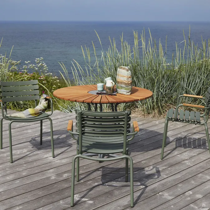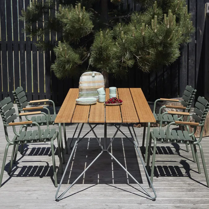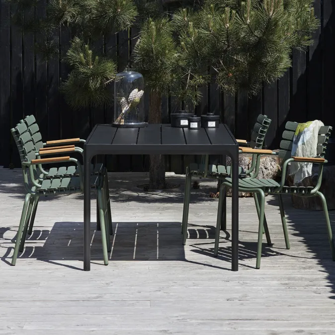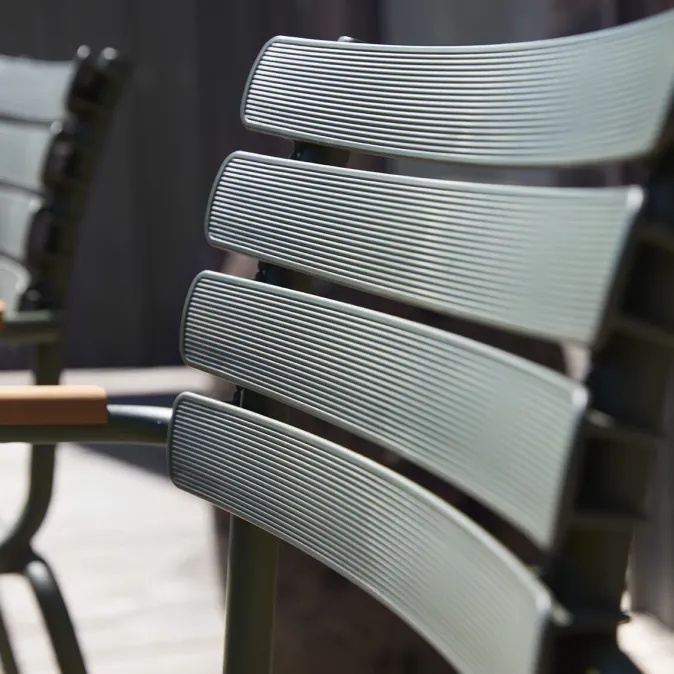 Superleichte, stapelbare Design Pieces für den Garten – aus recyletem Material! »ReClips« ist eine Stuhlserie mit breiten Kunststofflamellen, die auf einen leichten, pulverbeschichteten Aluminiumrahmen geklemmt werden. Die Lamellen werden aus dänischem Haushaltsabfall hergestellt und in Dänemark produziert. Die Technologie, die hinter der Wiederverwendung von Kunststoffabfällen für die Möbelproduktion steht, wurde in Dänemark entwickelt. Bei »ReClips« handelt es sich im Grunde um das Ergebnis einer Mischung aus dänischem Design und dänischer Innovation – und der Umsetzung dieser neuen Denkweise und Materialien in einen Stuhl. Der Aluminiumrahmen in Kombination mit den UV-geschützten Kunststofflamellen reduziert den Pflegeaufwand auf ein Minimum. Die »ReClips« Stühle sind stapelbar.