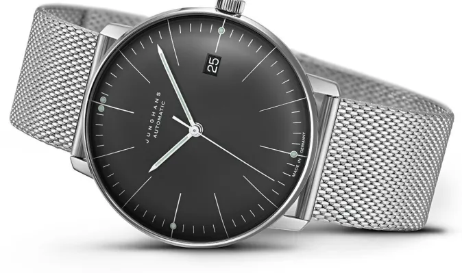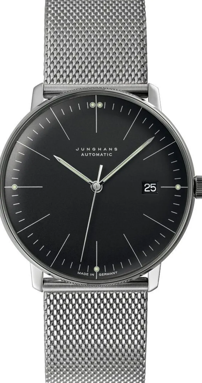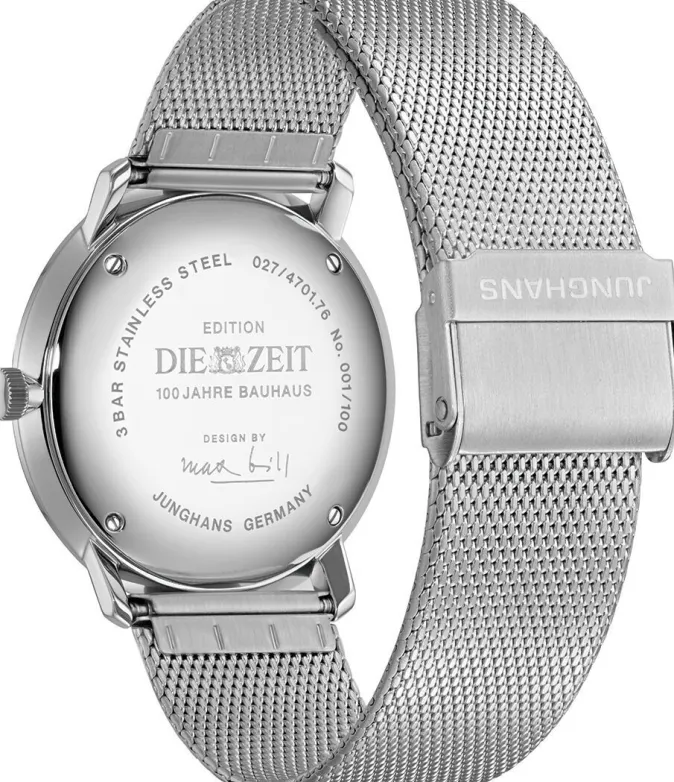 Anlässlich des 100-jährigen Bauhaus-Jubiläums hat der renommierte Uhrhersteller Junghans exklusiv für DIE ZEIT die Sonderedition »max bill Automatic« (ø 38mm) in charakteristischer Farbgebung kreiert. Nur für die Leser der ZEIT ist die Datumsscheibe des Automatikmodels Ton in Ton mit dem schwarz matten Zifferblatt gehalten. Das Herrenmodell interpretiert in seiner stilvoller Zurückhaltung und mit dem bewussten Verzicht auf überschwängliche Ornamentik den Grundsatz »Die Form folgt der Funktion«. Die geradlinigen Zeiger, das zurückhaltende Edelstahlgehäuse sowie die klare Formensprache des Zifferblattes reduzieren den Blick auf und für das Wesentliche – die Zeit. Gleichzeitig lässt die selbstbewusste Unaufdringlichkeit genügend Raum, um den Stil des Trägers zu betonen.