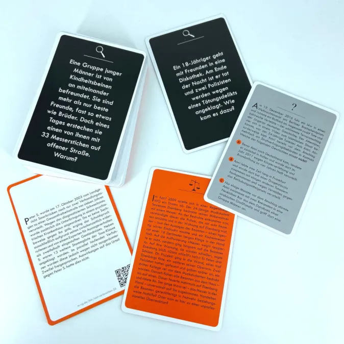 Im erfolgreichen Podcast ZEIT Verbrechen nehmen Sabine Rückert und Andreas Sentker alle 14 Tage spektakuläre Kriminalfälle unter die Lupe. In diesem Kartenspiel schlüpft man nun selbst in die Rolle des Kriminalreporters und geht der Wahrheit auf den Grund. Knifflige Wissenskarten stellen die fachliche Stärke der Spieler auf die Probe, bei den Spurenkarten müssen Kombinationsgabe und Spürsinn bewiesen werden und die Schuldkarten regen spannende Diskussionen zu Strafrecht und Gesellschaft an. Wer hat das Zeug zum Gerichtsreporter und räumt beim packenden Spiel zum Nr. 1-Podcast der ZEIT so richtig ab?