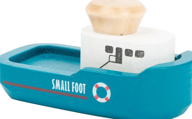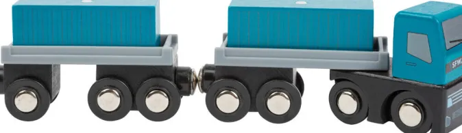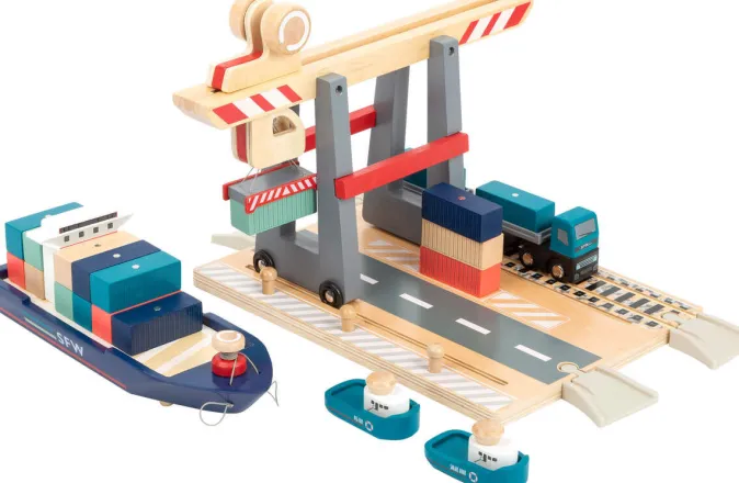 Spielvergnügen für die großen und kleinen Hafenkapitäne: Das aus Holz gefertigte Spielset beinhaltet eine Grundplatte mit Schienenverkehr und eine rollende Containerbrücke mit beweglichem Kran. Mit zwei Schleppern wird das Containerschiff an die Kaimauer gezogen, damit der Kran die magnetischen Container auf Lastwagen und Güterzüge verladen kann.