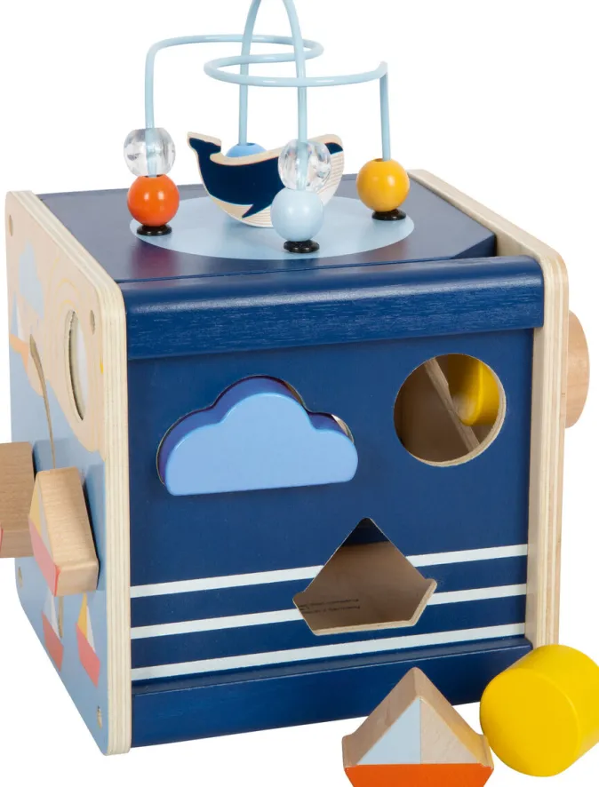 Dieser maritime Motorikwürfel »Großer Ozean« aus stabilem Holz bietet mit seinen verschiedenen Spielflächen und ansprechendem Design vielseitige Spielmöglichkeiten für Kinder. Der Motorikwürfel hat zwei Motorikschleifen, ein Formen-Steckspiel, ein Schiebelabyrinth und einem Drehklappen-Spiel auf fünf verschiedenen Spielflächen. In modernen Farben gestaltet und mit hohem Naturholzanteil versehen, fördert der Würfel die Wahrnehmung, Geschicklichkeit und Fantasie der Kinder. Durch abgerundete Kanten und die Integration von Unterwasser-Motiven bietet er nicht nur stundenlangen Spielspaß, sondern auch eine angenehme Haptik. Ein ideales Spielzeug für kleine Entdecker.