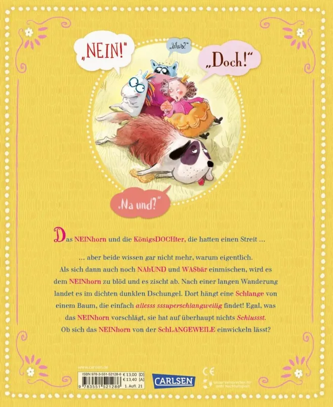 Als sich der NAhUND zum Erzieher aufspielt, wird es dem NEINhorn zu blöd und es zischt ab. Nach einer langen Wanderung landet es im dichten dunklen Dschungel, wo die SchLANGEWEILE von einem Assst runterhängt und allesss sssuper schlangweilig findet! Egal, was das NEINhorn vorschlägt, sie hat keine Schlussst darauf.