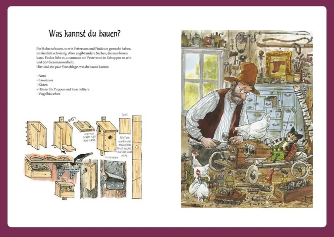 Seit der kleine Kater Findus bei Pettersson wohnt, stellt er das ruhige Leben des Alten ganz schön auf den Kopf. Immer ist irgendetwas los: Die beiden müssen zusammen den bösen Fuchs vertreiben, sie feiern Geburtstag oder gehen zelten. Und dann ist da noch Caruso, dieser blöde Hahn, der den Hühnern den Kopf verdreht … Der Sammelband mit Bastelideen, Rätseln und Rezept enthält die fünf Einzeltitel Wie Findus zu Pettersson kam, Kennst du Pettersson und Findus?, Ein Feuerwerk für den Fuchs, Findus und der Hahn im Korb sowie Pettersson zeltet.