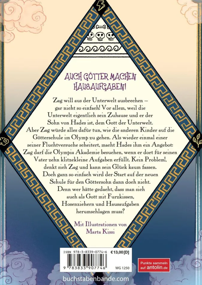 Zag will aus der Unterwelt ausbrechen! Gar nicht so einfach! Vor allem, weil die Unterwelt eigentlich sein Zuhause und er der Sohn von Hades ist – dem Gott der Unterwelt. Aber Zag würde alles dafür tun, wie die anderen Kinder auf die Götterschule im Olymp zu gehen. Als wieder einmal einer seiner Fluchtversuche scheitert, macht Hades ihm ein Angebot: Zag darf die Olympia Akademie besuchen, wenn er dort für seinen Vater zehn klitzekleine Aufgaben erfüllt. Kein Problem!, denkt sich Zag und kann sein Glück kaum fassen! Doch ganz so einfach wird der Start auf der neuen Schule für den Göttersohn dann doch nicht … Denn wer hätte gedacht, dass man sich auch als Gott mit Furzkissen, Hosenziehern und Hausaufgaben herumschlagen muss?