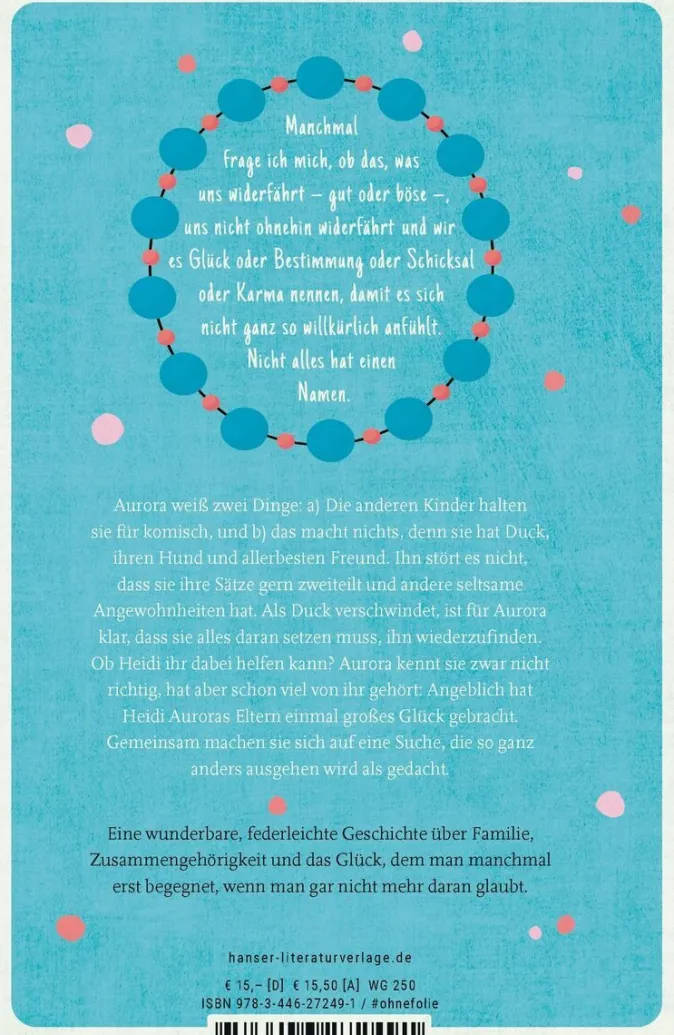 Aurora weiß zwei Dinge: a) Die anderen Kinder halten sie für komisch, und b) das macht nichts, denn sie hat Duck, ihren Hund und allerbesten Freund. Ihn stört es nicht, dass sie ihre Sätze gern zweiteilt und andere seltsame Angewohnheiten hat. Doch dann ist Duck plötzlich verschwunden, und Auroras Welt steht kopf. Nicht nur, dass sie ihren einzigen Freund wiederfinden muss, ihre Eltern bekommen auch noch Besuch von einer jungen Frau namens Heidi. Die ist scheinbar genau das, was Aurora nicht ist: normal, beliebt, ein wahres Glückskind. Aurora kennt sie nur aus Erzählungen und will nichts mit ihr zu tun haben. Das ändert sich erst, als Heidi ihre Hilfe anbietet: bei der Suche nach Duck – und nach Auroras eigenem Glück.