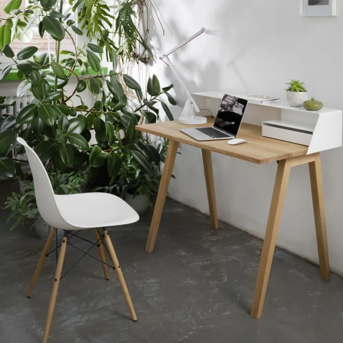 Lässig, mondän, formvollendet: Der Sekretär »PS 04« schafft Platz, hält Ordnung und bietet zugleich ein elegantes Äußeres, als ob es ihn schon seit Jahrzehnten genauso gäbe. Die Arbeitsplatte aus massiver Eiche und der farblich gestaltete Aufbau aus Metall liefern einen spannenden Material- und Farbmix. Ihr neuer liebster Arbeitsplatz wird zudem zur praktischen Ladestation für Laptop, Tablet und Smartphone.