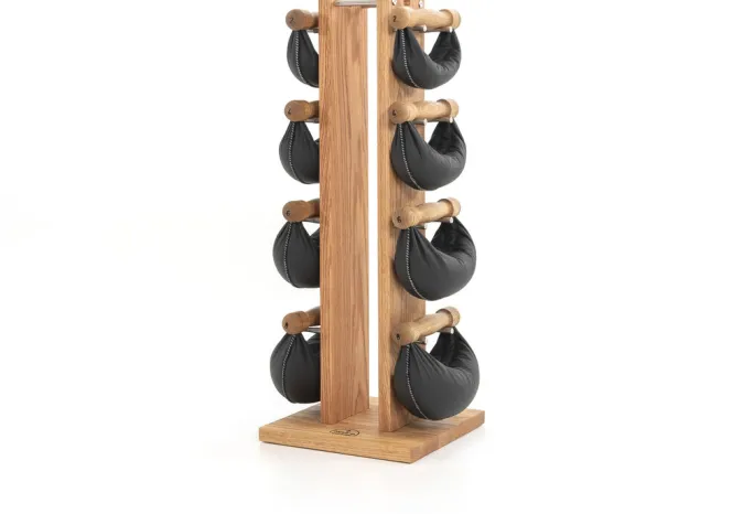Alle Swing Hanteln werden von Hand genäht und sind mit einem Eisengranulat befüllt, welches die Unwucht in der Bewegung unterstützt, da es sich im Ledersack verlagern kann. Nach dem Workout können Sie Ihre acht Swing Hanteln aus handgenähtem Echtleder am Swing Turm platzsparend und optisch ansprechend verstauen.