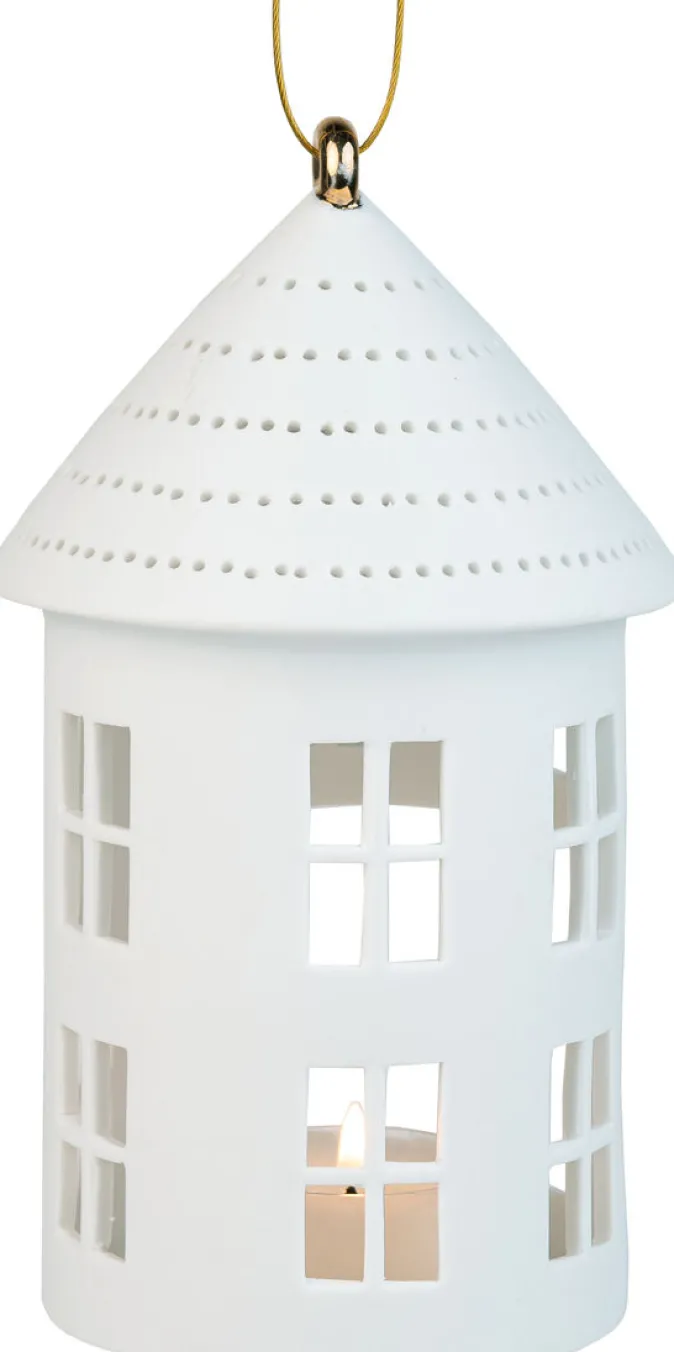 Das hängende Lichthaus von Räder sorgt mit seinem minimalistischen Design aus unglasiertem Porzellan für eine stimmungsvolle Beleuchtung. Der goldfarbene Ring und das Stahlseil ermöglichen eine stilvolle Aufhängung an Fenstern, Weihnachtsbäumen oder anderen dekorativen Plätzen.