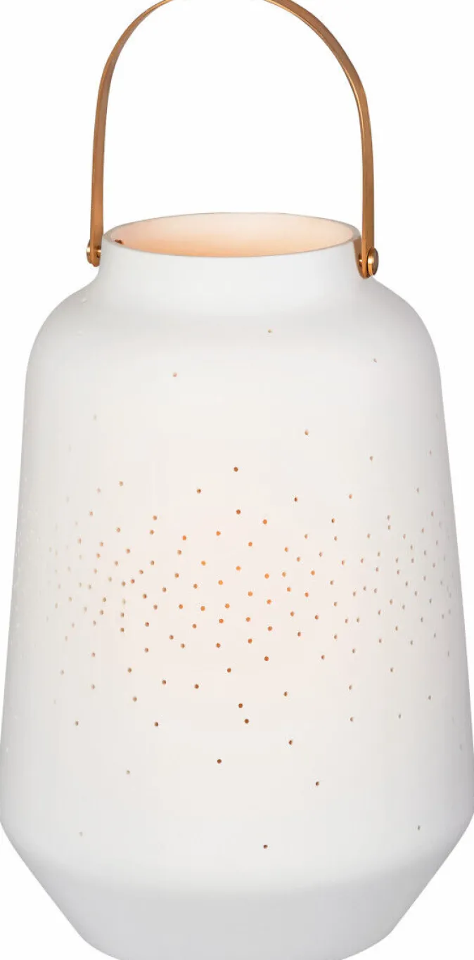 Diese handgefertigte Porzellanlaterne von Räder ist ein echter Blickfang für jede Jahreszeit. Die zarte Teelicht-Laterne aus Porzellan, kombiniert mit einem eleganten Metallgriff in Weiß-Kupfer, schafft ein warmes und einladendes Licht. Die feinen, eingearbeiteten Löcher lassen das Licht durchscheinen und zaubern eine stimmungsvolle Atmosphäre, die an einen funkelnden Sternenhimmel erinnert. Ob als Geschenk oder für das eigene Zuhause – diese Laterne ist eine wunderschöne Dekoration, die Liebe, Glück und Geborgenheit symbolisiert.