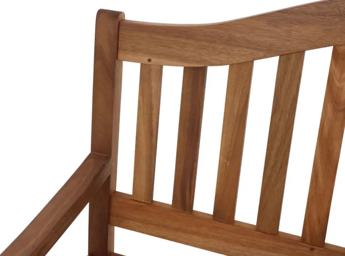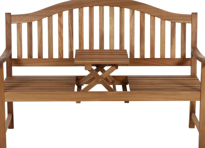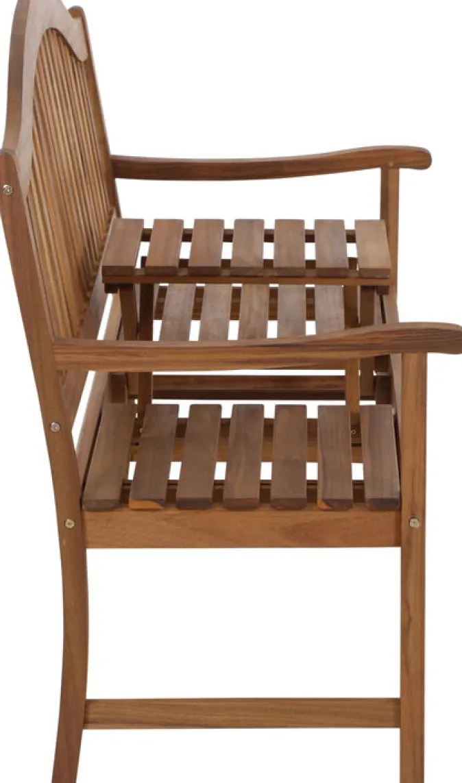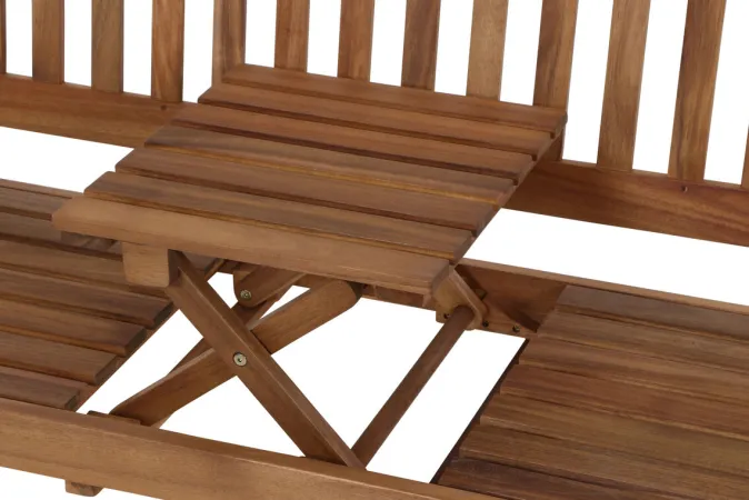 Diese hochwertige Bank aus 100% FSC®-zertifiziertem Akazienholz bietet entweder Platz für 3 Personen oder für nur 2 Personen, wenn der integrierte Tisch in der Mitte ausgeklappt ist. Er lässt sich im Handumdrehen nach oben herausziehen und verriegeln. Dieser kann leichte Lasten tragen und dient als Ablagefläche Getränke, Zeitungen oder Ähnliches. Wird der Tisch mal nicht benötigt, kann er genau so schnell wieder eingeklappt werden. Die Bank lädt durch seine leicht geschwungene obere Kante der Rückenlehne und der Armlehnen zum gemütlichen Sitzen ein. Alle Schraubverbindungen sind aus galvanisiertem Stahl und bieten höchste Stabilität.
