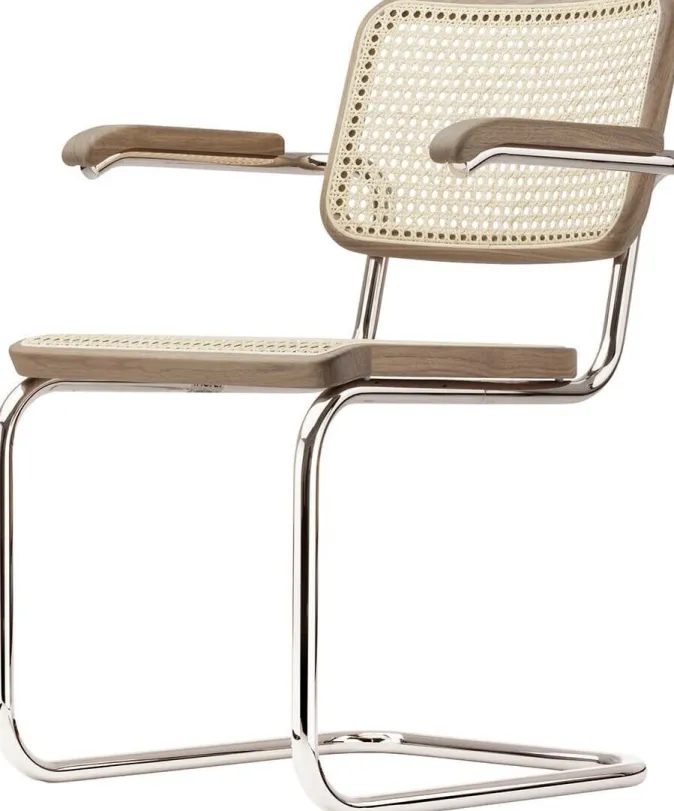 Unter den Stahlrohrmöbeln ist der Freischwinger »S 64« mit Armlehnen von Thonet besonders vielseitig. Er ist in unterschiedlichen gestalterischen Welten zu Hause. Zur kompromisslos modernen Einrichtung bei Ihnen daheim passt er genauso wie zum vielseitigen Mix, der unterschiedlichen Epochen und Stilen nebeneinander Raum gibt. Der Freischwinger »S 64« mit Armlehnen ist der bekannteste Stahlrohr-Klassiker. Zu seiner Popularität trägt die reizvolle Verbindung des Neuen mit dem Bewährten bei: Thonets Tradition in der Herstellung von Bugholzmöbeln mit charakteristischem Wiener Geflecht, in Kontrast zum revolutionären Einsatz von Stahlrohr. Sitz und Rückenlehne aus Massivholz mit Rohrgeflecht verkörpern Tradition, das Gestell Gegenwart und Zukunft. Ihre Vielseitigkeit macht sie zu den bis heute meist verkauften Freischwingern. Marcel Breuer entwarf den »S 64« in seiner Berliner Zeit 1928. Thonet produziert die beiden Modelle mit und ohne Armlehnen seit 1930. Durch ihre ästhetische Reduktion und Klarheit kombiniert mit dem luftigen Geflecht passen die Klassiker in unterschiedlichste Umgebungen wie Konferenzräume, Wartezonen, Restaurants und in die Wohnung.