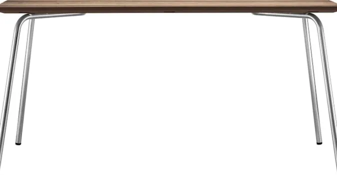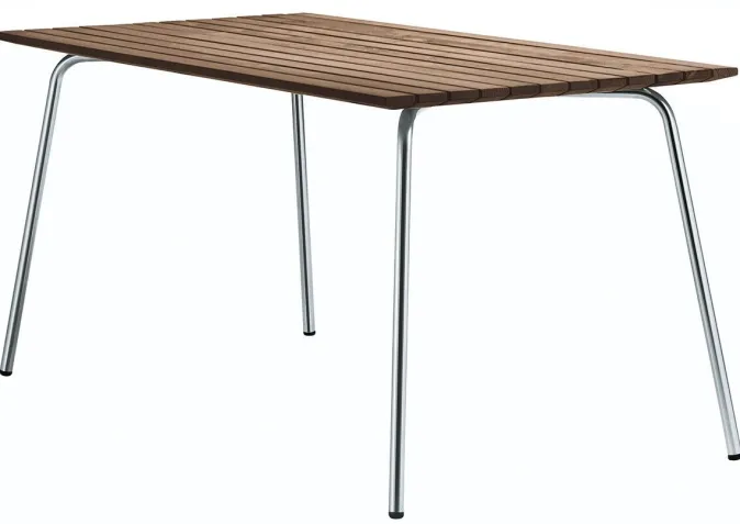 Die Holzleisten der ZEIT-Sonderedition Gartentisch »S 1040« aus der Möbelmanufaktur Thonet bestehen aus massivem Iroko, einem afrikanischen Holz mit hoher Dichte und Wetterbeständigkeit (FSC-Siegel). In seiner Optik ist es ähnlich wie Teak und hat eine glatte, gleichmäßige Oberfläche. Die ergonomisch geschwungenen Holzleisten erleichtern das Abfließen des Regenwassers und anschließende Trocknen. Zum Schutz werden alle Holzteile geölt, in der Sonderedition für DIE ZEIT wurde ein Sonderöl Teak verwendet.