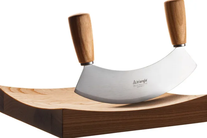 Das Wiegemesser »Soul« von triangle beeindruckt nicht nur durch sein elegantes Design mit fein gearbeiteten Griffen aus deutscher Kernesche, sondern auch durch seine außerordentlich hochwertige, gehärtete Klinge. Wiegemesser werden traditionell verwendet, um Kräuter, Nüsse, Knoblauchzehen und ähnliches schnell und einfach zu zerkleinern. Mit einer Länge von 23 cm sind größere Modelle jedoch auch ideal zum Schneiden von Pizza, Flammkuchen und Blechkuchen geeignet und machen auch auf dem Tisch eine gute Figur.