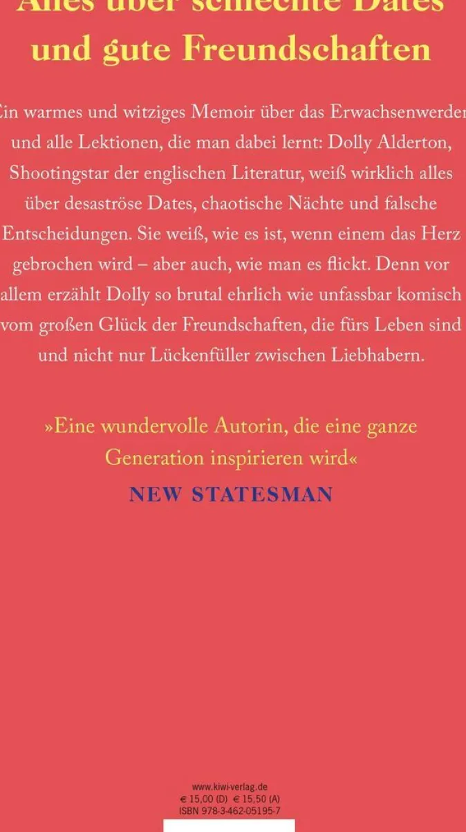 Ein warmes und witziges Memoir über das Erwachsenwerden und alle Lektionen, die man dabei lernt: Dolly Alderton, Shootingstar der englischen Literatur, weiß wirklich alles über desaströse Dates, chaotische Nächte und falsche Entscheidungen. Sie weiß, wie es ist, wenn einem das Herz gebrochen wird – aber auch, wie man es flickt. Denn vor allem erzählt Dolly so brutal ehrlich wie unfassbar komisch vom großen Glück der Freundschaften, die fürs Leben sind und nicht nur Lückenfüller zwischen Liebhabern. Dolly Alderton kennt alle Seiten der Liebe, die guten und die dunklen. Da ist der Guru, der tief in ihr Inneres schauen kann und der sich am Morgen nach der lang ersehnten ersten Nacht doch aus dem Staub macht. Oder ein dubioser Kerl in New York, der sie zu einem Dreier überreden will. Oder der verplante Hippie, für den sie sich die Haare abrasiert. Und dann stellt Dolly plötzlich fest, dass es Liebe auch ganz anders gibt und dass die Freundschaften mit ihren Mädels ihr mehr über die Liebe beigebracht haben als alle Männer. Freundinnen, die für einen da sind, wenn man nicht weiß, wovon man die Miete zahlen soll, wenn eine Beziehung zerbrochen ist oder die Rod-Stewart-Mottoparty nach hinten losgeht.