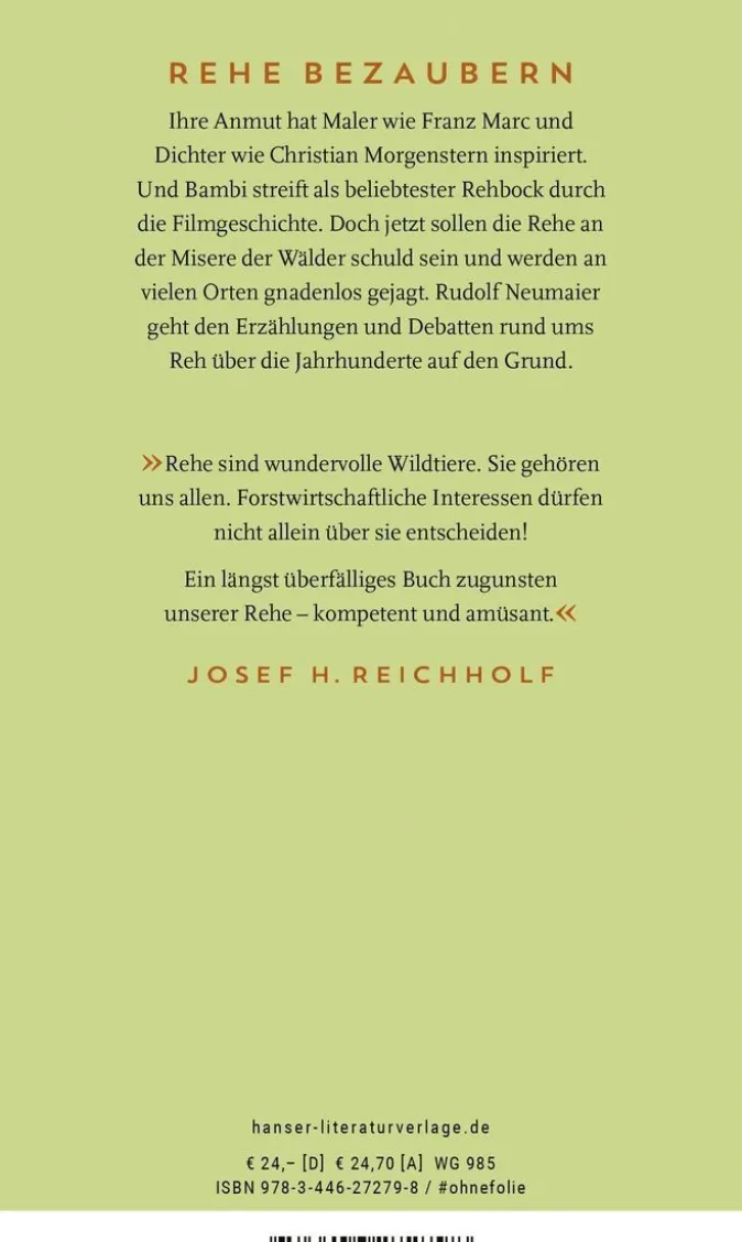 Verehrt, besungen, gejagt – die faszinierende Kulturgeschichte des Rehs als Inspiration für die Menschen von Hildegard von Bingen bis Franz Marc Rehe bezaubern. Ihre Anmut hat Maler wie Franz Marc und Dichter wie Christian Morgenstern inspiriert. Und Bambi streift als beliebtester Rehbock durch die Filmgeschichte. Doch jetzt sollen die Rehe an der Misere der Wälder schuld sein. Rudolf Neumaier beleuchtet die Erzählungen und Debatten rund ums Reh über die Jahrhunderte hinweg. Erstmals erzählt er die faszinierende Kulturgeschichte des Rehs vom Wildbret der kleinen Leute zum Emblem von Tattoo-Studios. Eine Hommage an das Reh und ein Weckruf für alle, denen die sagenhaften Waldwesen am Herzen liegen.