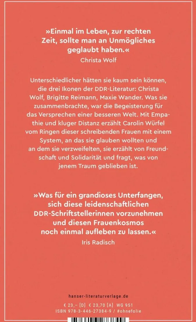 Christa Wolf, Brigitte Reimann und Maxie Wander – Carolin Würfel porträtiert diese drei Ikonen der DDR-Literatur und wirft einen modernen Blick auf das große Versprechen des Sozialismus.Christa Wolf, Brigitte Reimann, Maxie Wander – waren sie Träumerinnen oder Macherinnen, diese drei Frauen, die zu Ikonen der DDR-Literatur wurden? In ihrem atmosphärischen Porträt zeigt Carolin Würfel drei Schriftstellerinnen, die im Temperament unterschiedlicher kaum sein könnten und die doch eines eint: die Begeisterung für das Versprechen des Sozialismus, die Bereitschaft, den Traum vom neuen Menschen in ihrem Alltag, ihrer Arbeit und ihren Beziehungen umzusetzen. Mit welchem Selbstbewusstsein diese Frauen in den 1950er- und 1960er-Jahren ihre Ziele verfolgen, sich dabei als Freundinnen stützen – wie ihre Träume aber auch platzen, davon erzählt Carolin Würfel inspiriert und mitreißend und lässt ein Stück Zeitgeschichte lebendig werden.